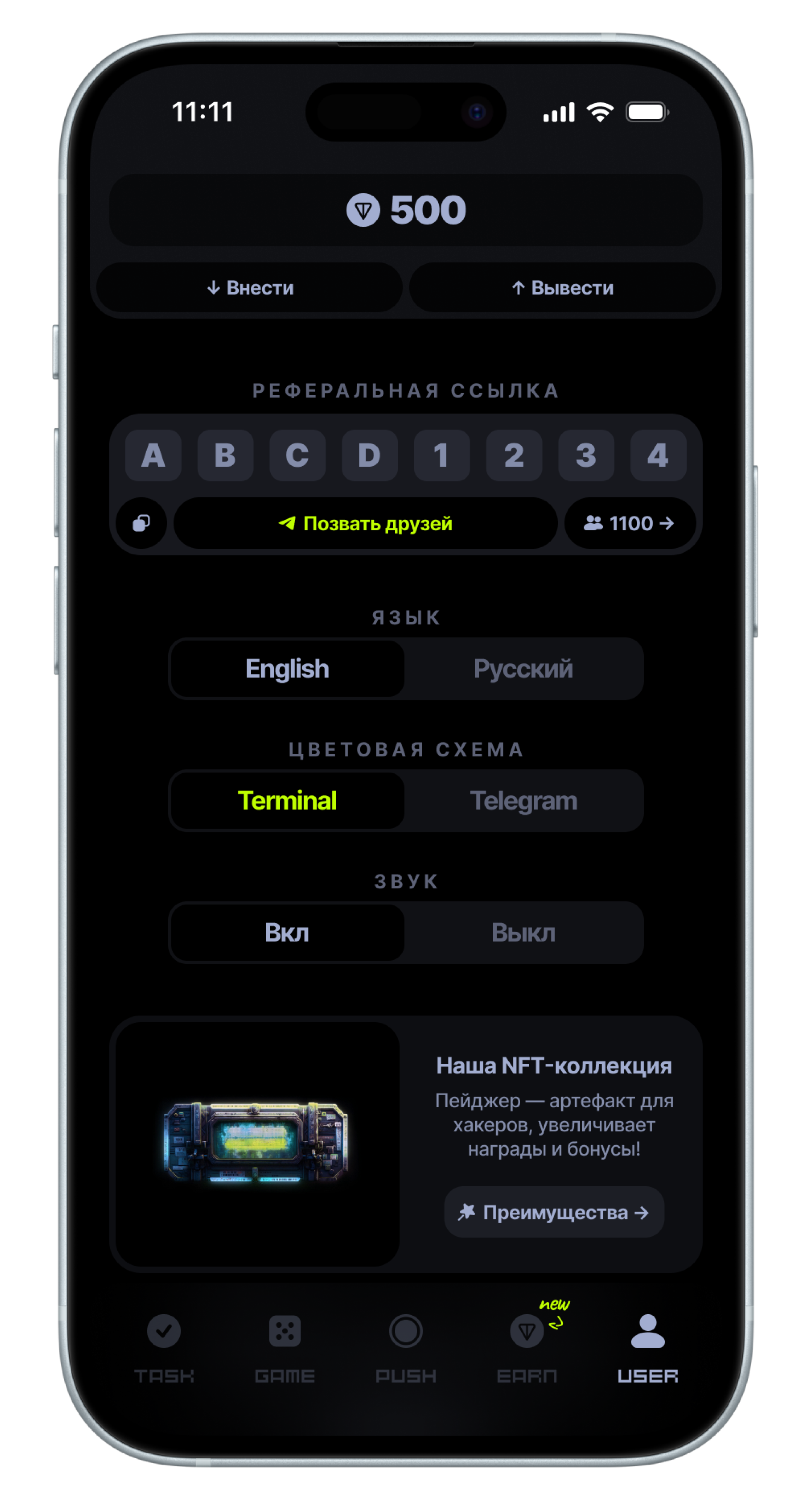На странице профиля пользователь может пригласить друзей по реферальной ссылке и получать пассивный доход с их пополнений. Здесь же находятся настройки приложения, ссылки на ТП, гайд, соц. сети и CTA на покупку NFT из коллекции, так же дающей особые условия.