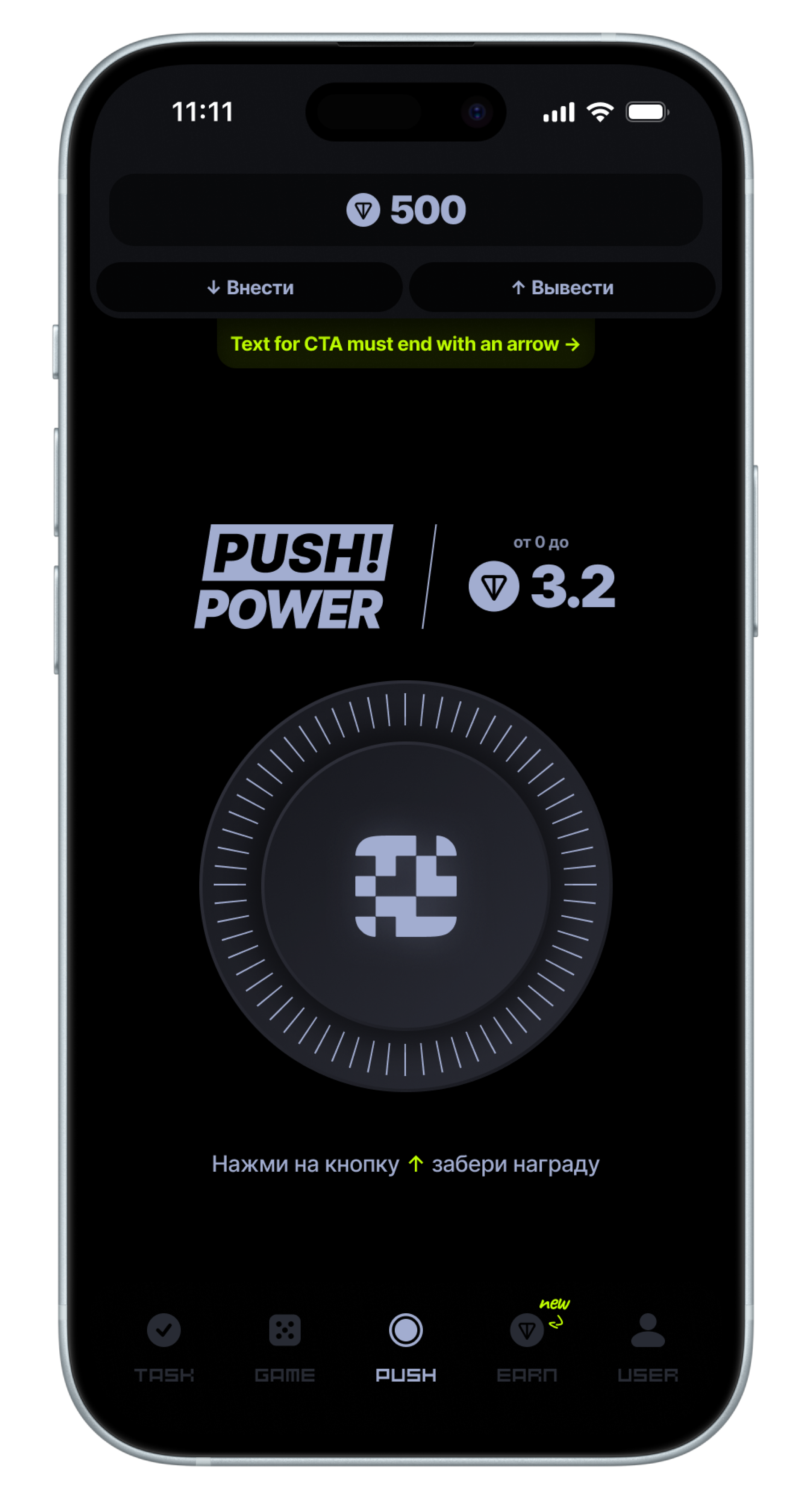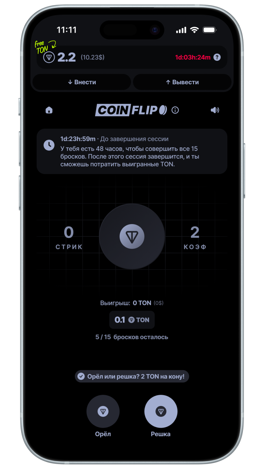 В Монетке пользователь может играть на внутреннюю волюту с ограничением по количеству игр, а также на TON без ограничения. Добавил стрики и увеличение коэффициента с каждым новым броском для удержания пользователя в игре.