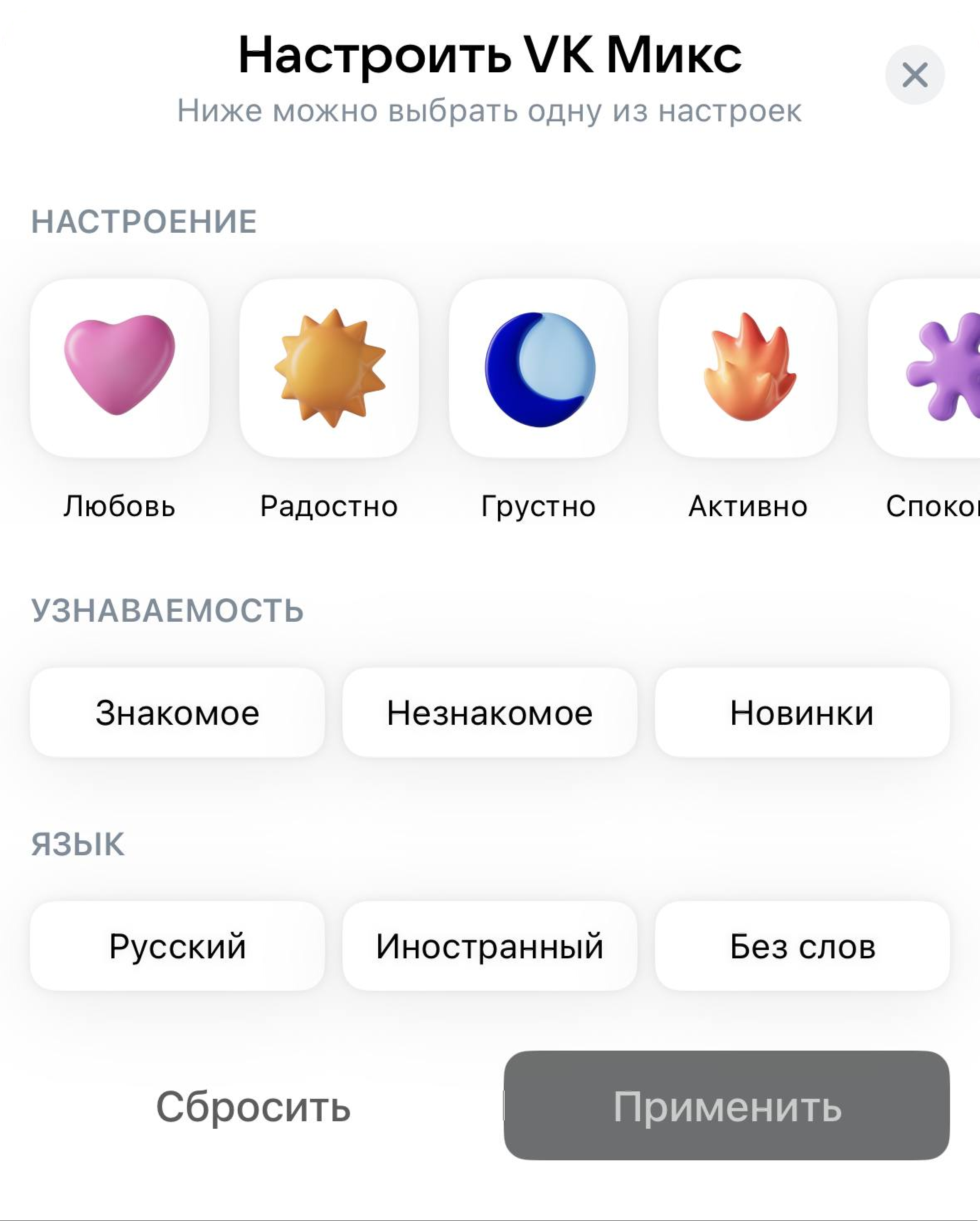 В VK Музыке реализованы фильтры по настроению, узнаваемости и языку. Они позволяют пользователю быстро «собрать» релевантный поток треков под предпочтения. Такой подход снижает барьер при взаимодействии с новым или неизвестным контентом — это особенно важно для «Музыки будущего», где нет привычных для пользователя ориентиров.